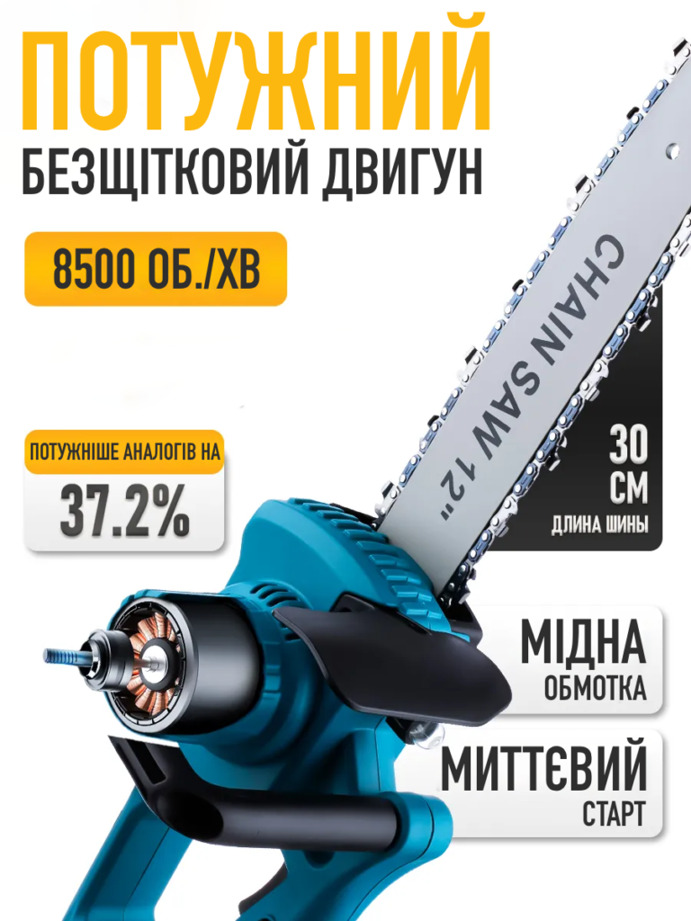 Шина 30 см та 45 ланок ланцюга з високовуглецевої сталі дозволяють розпилювати колоди діаметром до 30 см всього за 8 секунд.