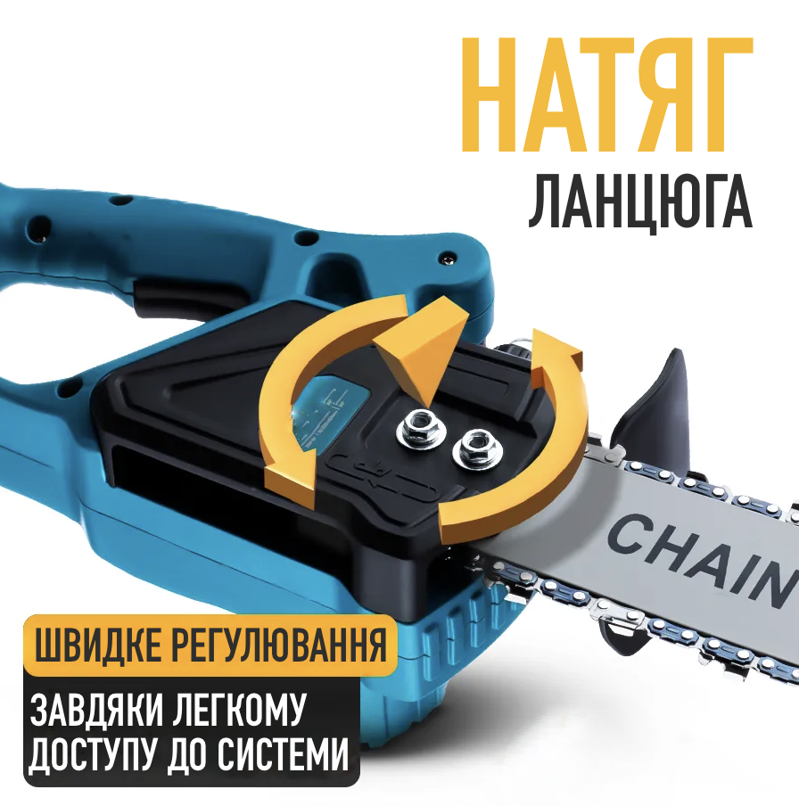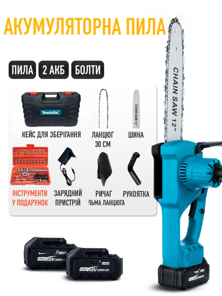 Ланцюгова пила з 2 акумуляторами 6.0 Ah працює зі швидкістю 8500 об/хв, що забезпечує високу продуктивність. У комплекті ланцюг та шина 30 см для точного й швидкого розпилу. Автоматична подача оливи зменшує знос і підтримує ефективність роботи. Набір інструментів на 46 елементів – у подарунок.