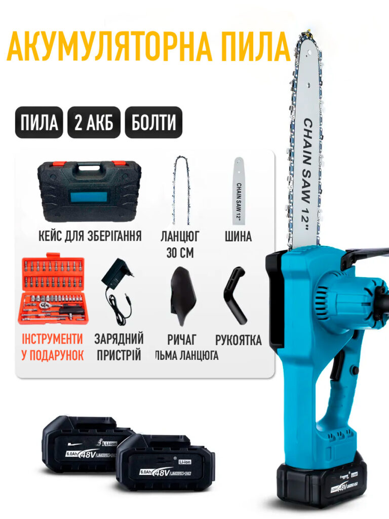 Ланцюгова пила з 2 акумуляторами 6.0 Ah працює зі швидкістю 8500 об/хв, що забезпечує високу продуктивність. У комплекті йдуть ланцюг та шина 30 см для точного й швидкого розпилу. Автоматична подача оливи зменшує знос і підтримує ефективність роботи. Набір інструментів на 46 елементів – у подарунок.